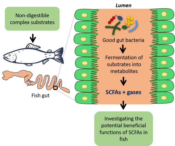一般来说,肠道内的大多数厌氧细菌对于不易消化的复杂基质具有惊人的发酵能力,这种发酵过程会产生细菌代谢产物,如短链脂肪酸(SCFAs)和一些其他气体。醋酸纤维素、丁酸盐和丙酸盐是研究最多的短链脂肪酸。这些短链脂肪酸因其对人类和养殖动物肠道健康有益而备受关注。获取短链脂肪酸方面的相关知识对于改善养殖鱼类的健康非常有益,但目前我们对这方面所了解的信息知之甚少。