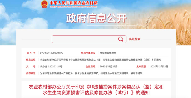 为依法惩治非法捕捞水产品行为,强化水生生物资源保护,推进渔业水域生态文明建设,根据《中华人民共和国渔业法》等法律法规规定,农业农村部研究制定《非法捕捞案件涉案物品认(鉴)定和水生生物资源损害评估及修复办法(试行)》(以下简称《办法》)。